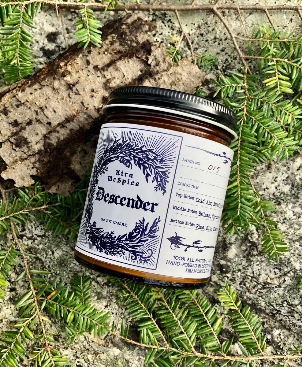 This fragrance pairs with my song “Descender” which was written in the winter of 2018. At the time I was working at a flower shop that sold tiny christmas trees and I would listen to a lot of music that involved harp and choir, inspiring the instrumental arrangement for the song. Descender feels like being outside while it’s snowing. I think about christmas lights when I hear it- like the twinkling omnichord in the song. It is the beginning of a long journey. The song starts with me doing dishes in the kitchen and looking out the window and seeing a fire on a hill. I imagine myself in the fire, melting down to the center of the earth where the flame is blue.